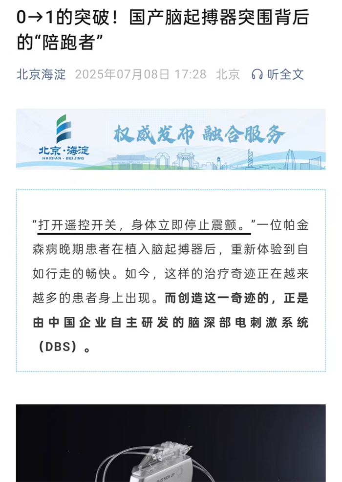 “打开遥控开关,身体立即停止震颤。”一位帕金森病晚期患者在植入脑起搏器后,重新体验到自如行走的畅快。如今,这样的治疗奇迹正在越来越多的患者身上出现。而创造这一奇迹的,正是由中国企业自主研发的脑深部电刺激系统(DBS)。